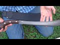Today, I know around a nice calm we’re this machete is an Indonesian style machete with a thick heavy blade and it is 14 and a quarter inch long on the blade. The blade steel is, the 1075 high carbon steel. It has a really nice hard wood handle you’ll notice that there’s a fluted brass lanyard hole in the butt in and the grip on. This is very comfortable. You get a good, solid grip on that, and it’s not going to slip out of your hand when you’re doing heavy chopping work.