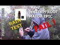 Well, it’s already starting to rain. Well like sprinkles, so no big deal put my hat on and hang for a while stay tuned and it starts well. I got two matches here, both claim to be waterproof. One claims super waterproof and you can probably see which one that is, but a little bit in the rain and we’ll find out seven minutes. It’s been sitting in the water in the rain all right after ten minutes in the rain that small one is actually floating around in there and the really robust tighten it’s just waiting to be struck.